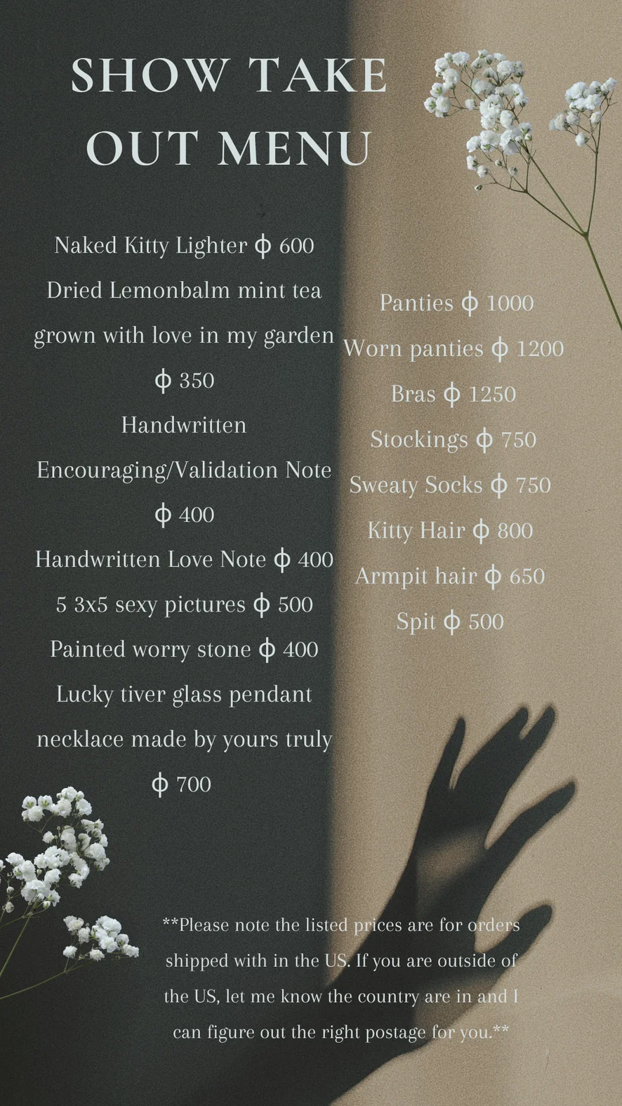 2. My tip menu changes if I am outdoors, please review it so you know all the new things I offer only outside!